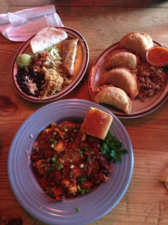 Taco and Enchilada Combo, Corn and Black Bean Empanadas and Chicken and Chorizo Etouffee. The portions are huge and the food is delicious!