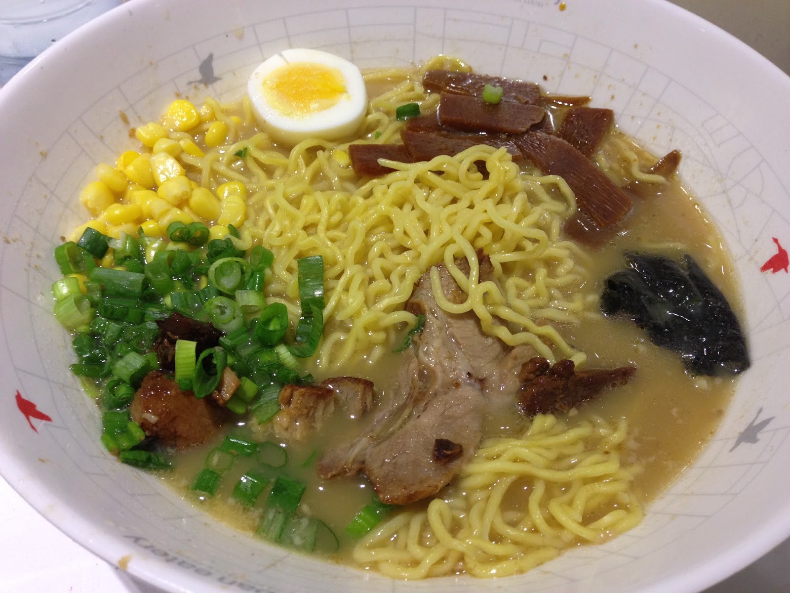 Shoyu pork noodle soup - light savoury soup w/ bamboo, corn, nori, scallions, and egg.