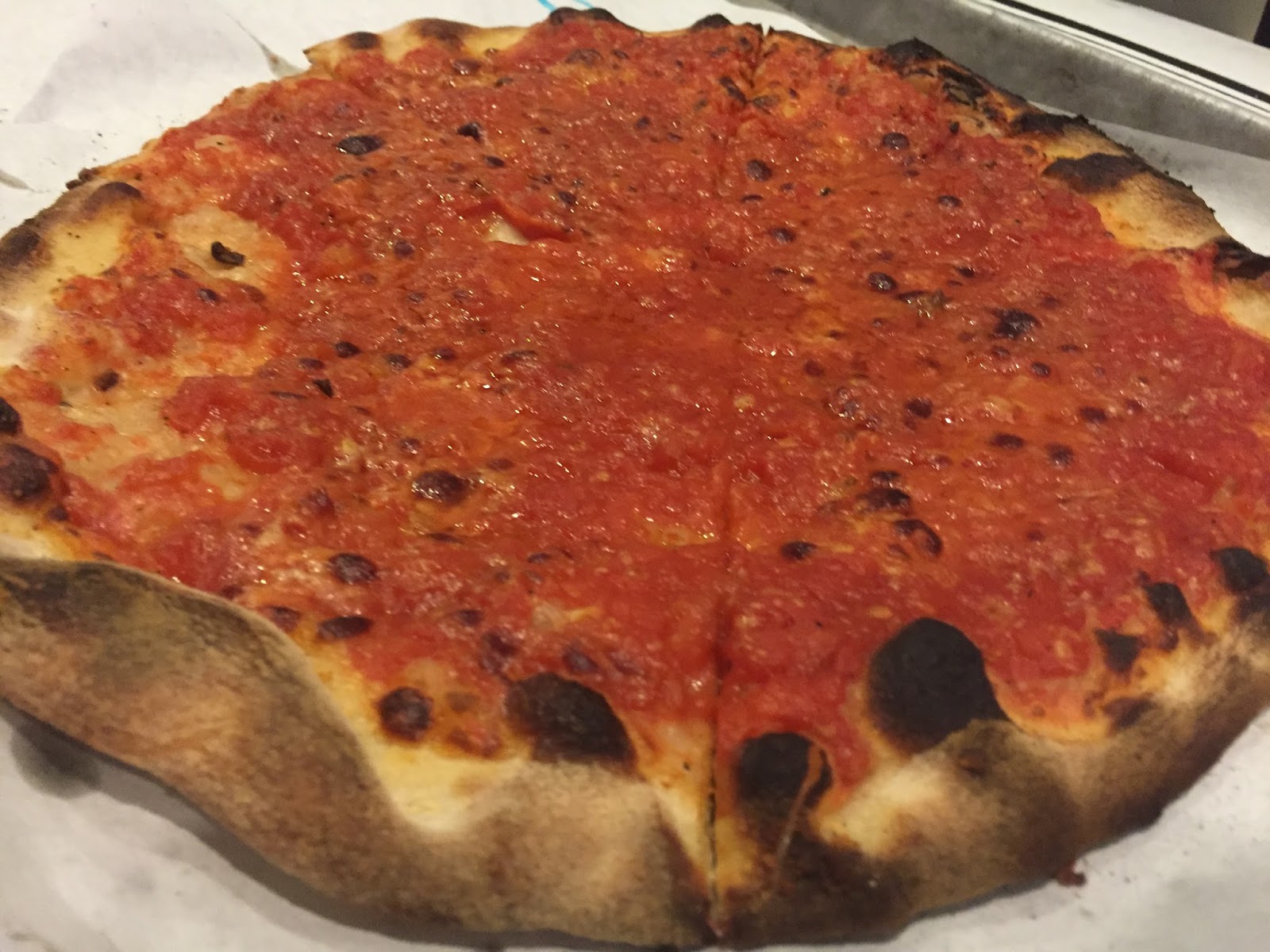 This tomato pie was amazing. The pizza dough held well with the abundance sauce on top. The crust was crisp, charred, and chewy. I could taste the freshness of the tomato sauce.